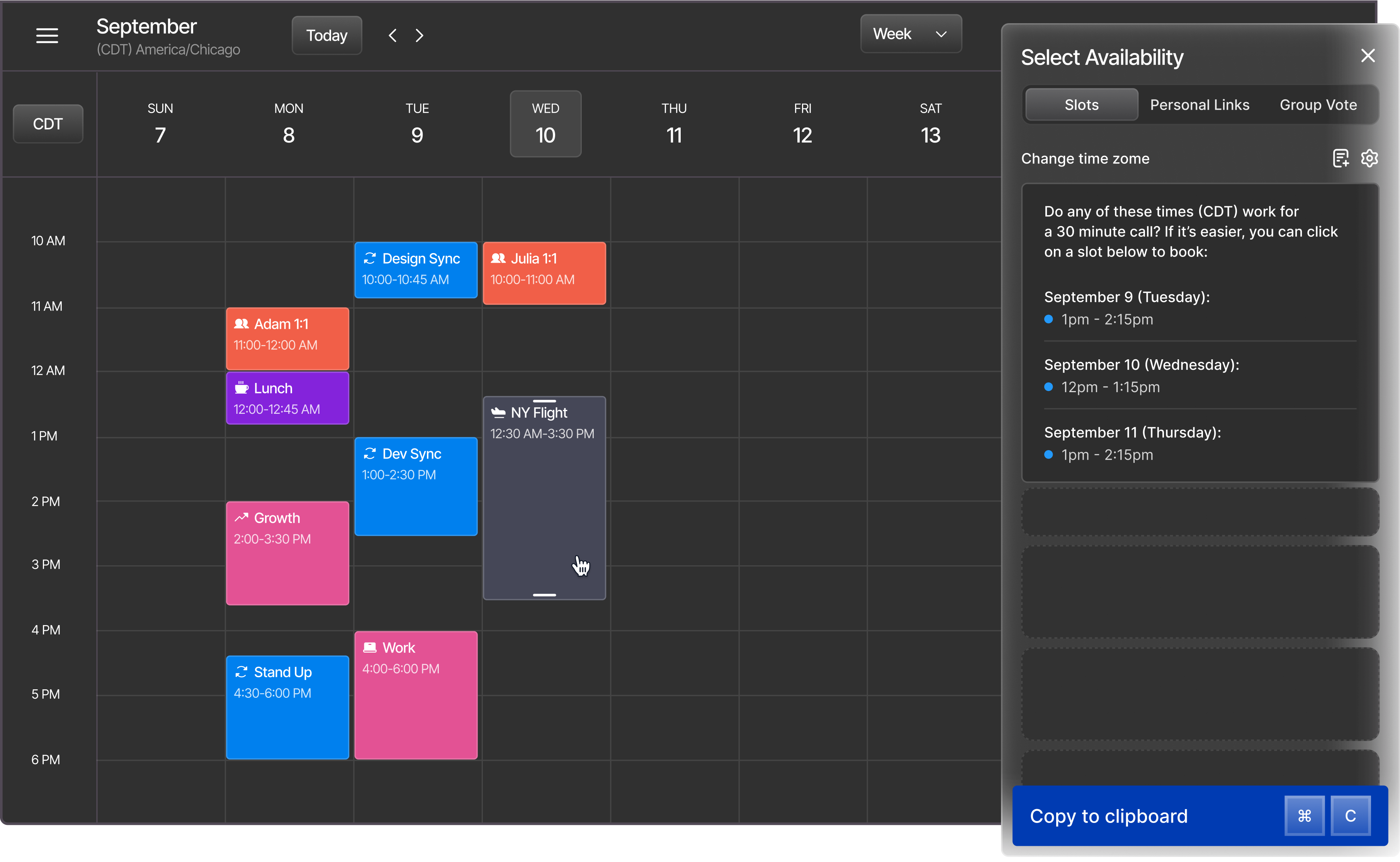 Sharing booking links is awkward. Typing out your availabilities is tedious. Vimcal gives you the best of both worlds.
